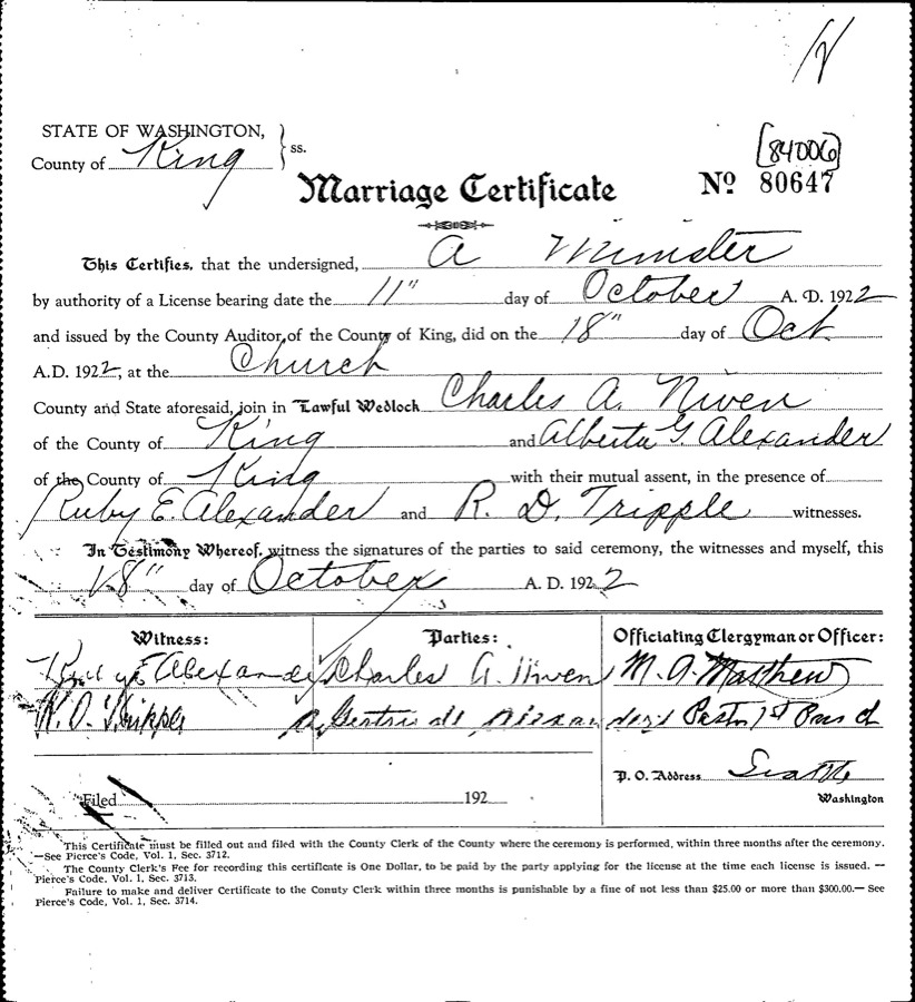 Charles A NIVEN & Alberta Gertrude ALEXANDER